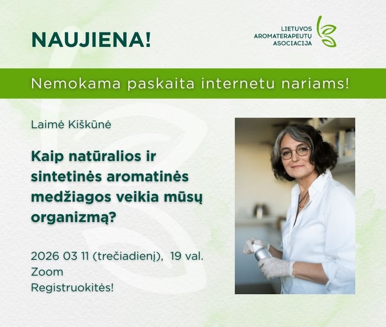 Nuo šiol Lietuvos aromaterapijos asociacija (LAA) savo nariams kasmet surengs bent 6 nemokamas paskaitas internetu! Jas ves tikrosios LAA narės ir kviestiniai lektoriai. Tyrinėsime plačiausią aromaterapijos temų spektrą: nuo mokslinės biochemijos, holistinio taikymo, aromapsichologijos iki saugaus naudojimo namuose.