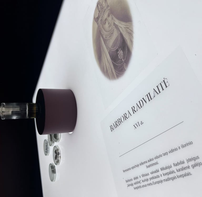 Kvepalų formulės visais laikais buvo laikomos paslaptyje, tad nebuvo lengva atrasti istorinių kvepalų aprašus ir ingredientus. Apie Lietuvos parfumeriją žinių ypač mažai, tad parfumerė Jolanta Cinaitienė pasirinko atkurti karalienės Barboros Radvilaitės kvepalus, apie kuriuos buvo galima atrasti patikimos informacijos Krokuvos archyvuose. Tikriausiai smalsu, kuo kvėpinosi iškiliausia Lietuvos didikė, Lietuvos ir Lenkijos karalienė? Barbora Radvilaitė nebuvo tipiška Renesanso moteris. Kai tuo metu Europoje praustis nebuvo madinga, Barbora prausdavosi pašildyto vandens kubile ilgai ir dažnai. Šį įprotį iš mylimosios perėmė ir Žygimantas Augustas. Istoriniuose šaltiniuose aptiktame paveiksle matyti, kad prie Barboros Radvilaitės diržo kabo pomanderis (apvalus sidabrinis papuošalas su skylutėmis, į kurį buvo patalpinami sausi kvepalai, kurie nuo judesio linguodavo ir skleisdavo aromatą).
