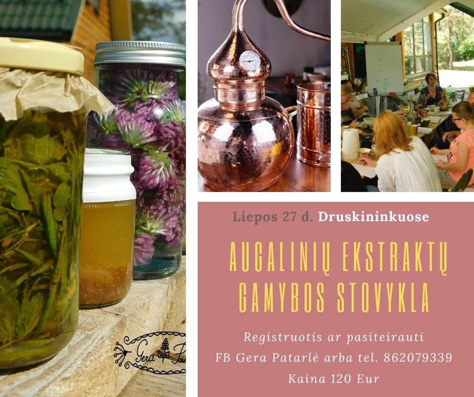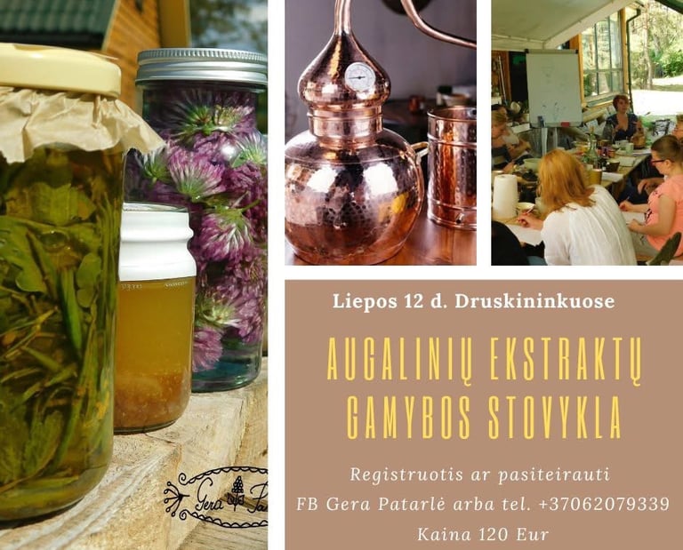Liepos 27 d. vaizdingoje vietoje prie Druskininkų vyks 1 dienos teorinė/ praktinė stovykla."Augalinių ekstraktų gamyba". Intensyvios stovyklos metu kiekviena dalyvė gamins net tris skirtingus ekstraktus. Pažindinsimės su augalais, juos grupuosim. Pasinersim į ekstrahavimo teoriją bei praktiką nuo seniausių laikų iki šiuolaikinių ekstrahavimo technologijų. Stovykla tiks tiek pradedantiesiems, tiek pažengusiems dalyviams. Visa kursų informacija bus labai praktiška ir sisteminga.