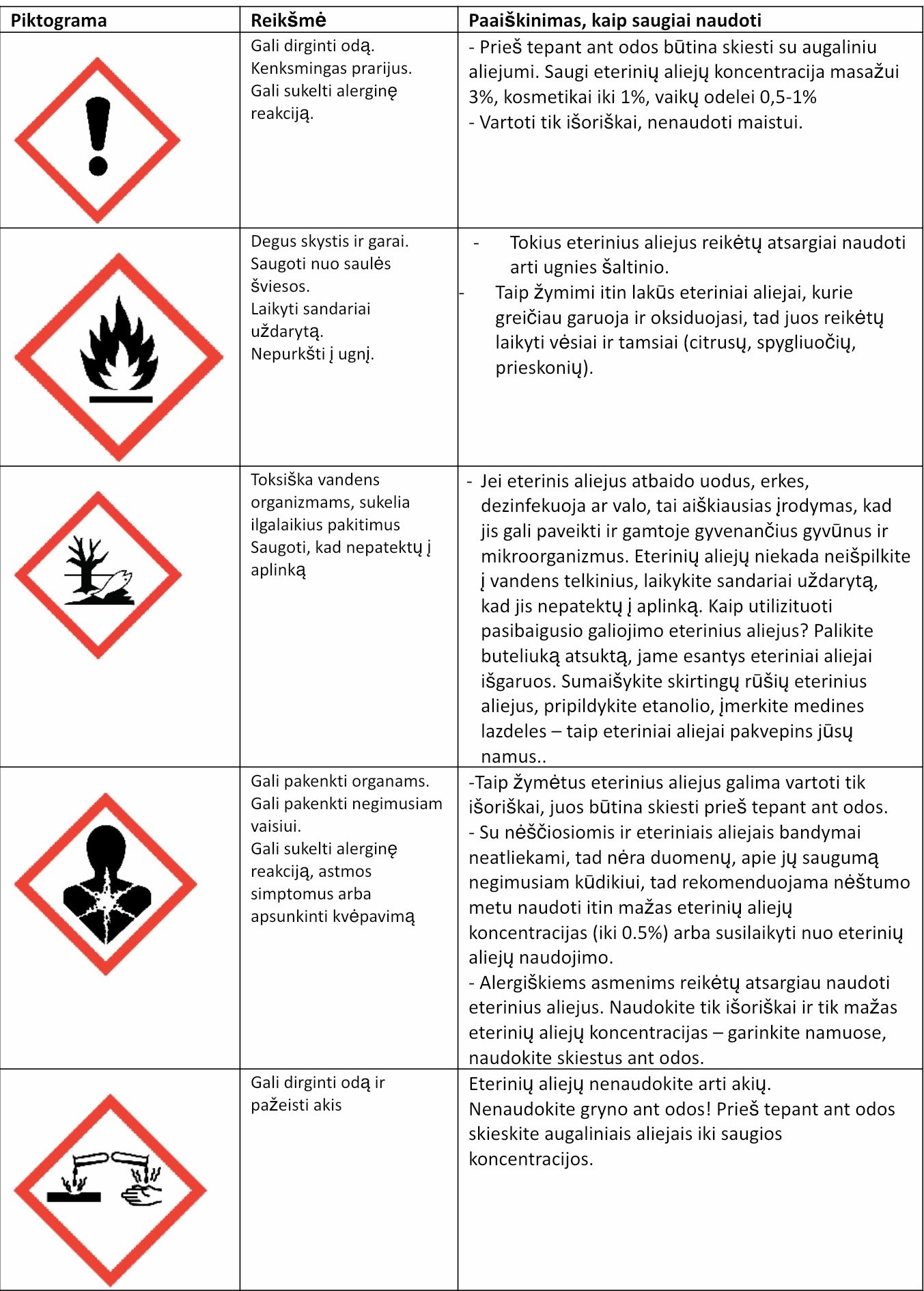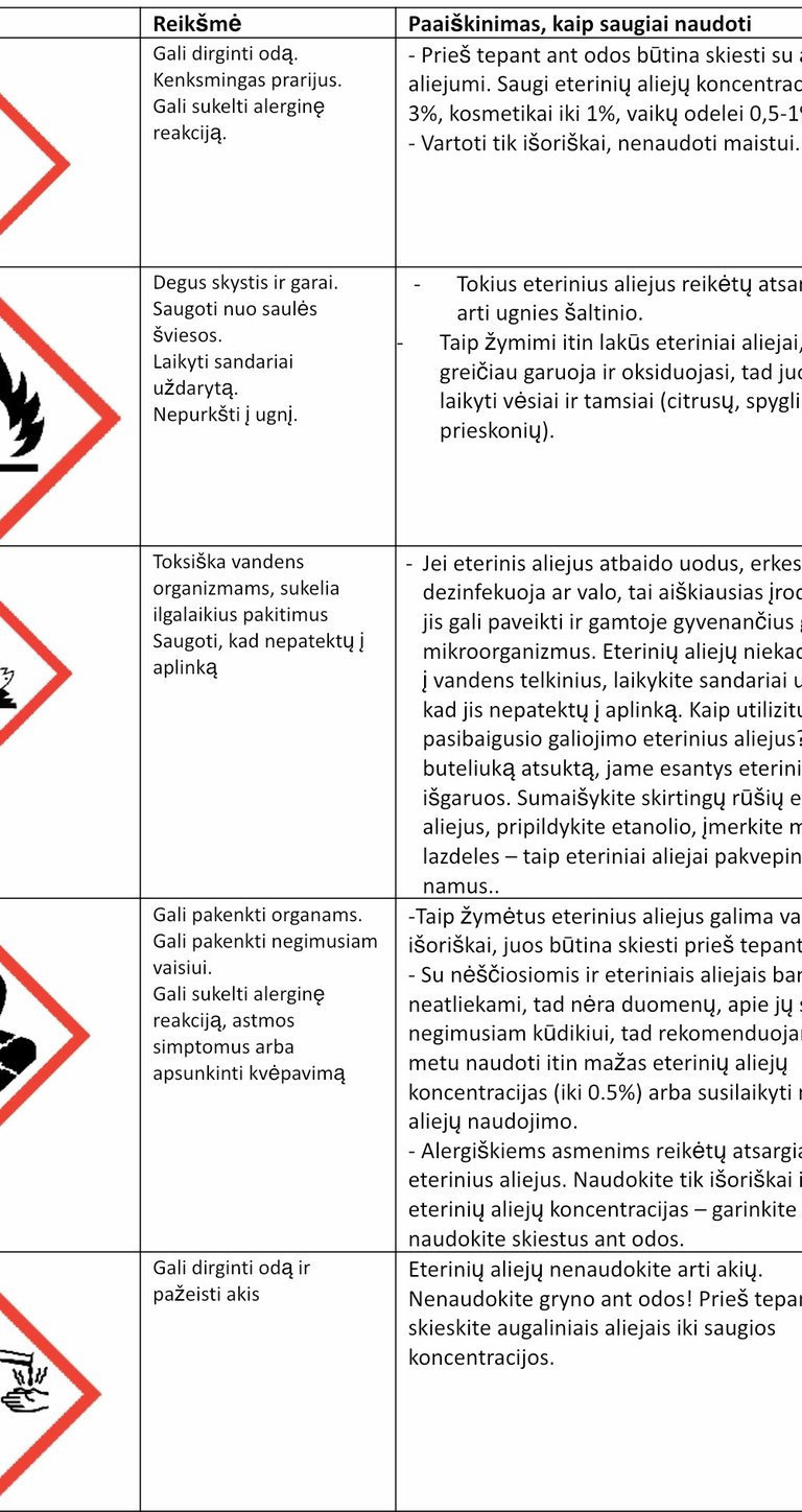 Šios piktogramos privalo atsirasti ant visų eterinių aliejų pakuočių, pardudoamų Lietuvoje. Jei nėra jokios piktogramos, tai nereiškia, kad šis eterinis aliejus švelnesnis ar saugesnis, tai reiškia, kad pardavėjas nesilaiko teisės aktų, reglamentuoajnčių eterinių aliejų ženklinimą, nes jie galioja visiems.