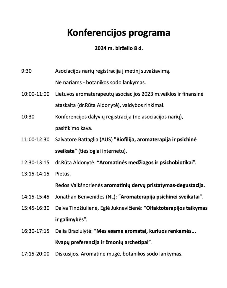 Lietuvos aromaterapeutų asociacija, jungianti aromaterapijos profesionalus ir entuziastus, organizuoja metinę konferenciją, kurios tema “Aromaterapija psichoemocinei sveikatai”. Ši tema 2024 m. pasirinkta ne atsitiktinai, bet atsižvelgiant į visuomenės psichinės sveikatos ir emocinės būklės blogėjimo tendencijas. Ši tema praktiškai pritaikoma kasdieniniame gyvenime, nes aromaterapija yra gali būti plačiai naudojama gerinant psichinę ir emocinę mūsų sveikatą. Konferencija skirta ne tik aromaterapeutams, bet ir psichologams, pedagogams, visuomenės sveikatos specialistams bei kiekvienam, norinčiam geriau suvokti praktines aromatinių substancijų pritaikymo galimybes kasdieniniame gyvenime.